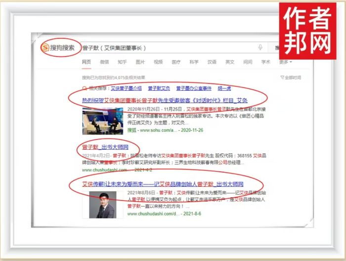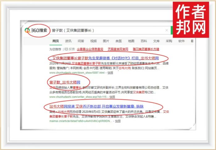 近日,艾侠集团董事长曾子默书作者关键词收录360、搜狗、百度平台。大众只需在360、搜狗、百度三大平台页面搜索“艾侠集团董事长 曾子默”等相关关键词,即可获取大量曾子默老师个人及其品牌的相关内容。通过这样高效快速的方式,曾子默老师的个人品牌得到全面推广,这不仅能够提升曾子默老师个人魅力和品牌实力,同时有效增强其品牌影响力和知名度,提升大众对品牌的好感,将大众转变为品牌顾客,最终成功实现个人IP变现。