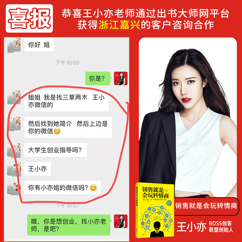 近日,依托于诚信书作者平台的品牌维系与信息传播,浙江嘉兴一网友便通过出书大师网的出后服务部,联系上了客服工作人员问询王小亦老师的行业信息。对方明确表示希望能够与王小亦老师取得联系,获取创业相关的经验分享与知识讲座。