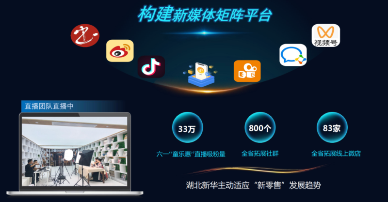 二是新建新媒体矩阵平台。湖北新华主动适应“新零售”发展趋势,强力推进智慧书店建设,上线九丘网自营网上平台,推进全省统一会员管理体系,积极应用新媒体工具,建立了全省联合直播新模式,打造了以微信生态、抖音等平台为基础,图文、短视频、直播三位一体的新媒体营销矩阵,实现了以渠道变革提升营销升级,社群营销强化场景体验,满足了融媒时代的消费需求。