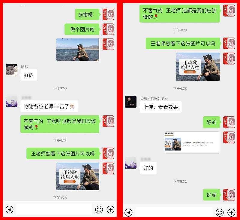 最近,作者邦网就与一位书作者客户进行了仔细的信息服务沟通交流。双方针对客户品牌页面上的图片信息调整更换、客户经历信息内容的修正、品牌故事内容表达细节的完善等,进行了细致而周全的交流与探讨。并且,作者邦网团队还就书作者客户的宝贵意见认真对待,并立即采取行动细心、细致而又准确地将相关信息进行了修改和调整。从而,收获了客户的满意表态。