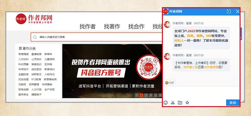 近日,书作者营销品牌网站作者邦网品牌营销服务升级,全面优化信息传播、业务互动、服务方式等模块,在有效提升读者、客户便利的同时,也提高了网站自身的影响力与知名度,从而,让服务更显亲切度和友好性。许多主动前来咨询业务的新客户,陆续不断。