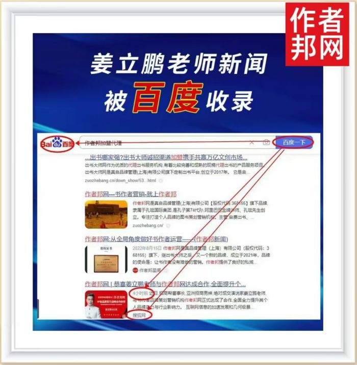 近日,作者邦网为书作者姜立鹏老师撰写的品牌策划文章于各大平台进行推广宣传,短时间内便迅速被百度、天眼查等权威媒介所收录。有效地提升了作者邦网与书作者的知名度与影响力等,并共同创造了有利的多方共赢局面。