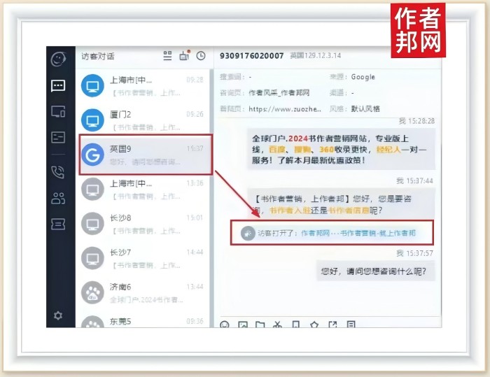 信息中显示,英国访客是于北京时间15点37分正式打开作者邦网的页面,并进行了访问。访客的IP地址为129.12.3.14,展示其位置是来自于英国地区的。单从能够对话记录中可以看出,访客是直接通过作者邦网的页面入口进入并打开了访问对话框,其呈现的是访客的主动性和对作者邦网的一定了解度。