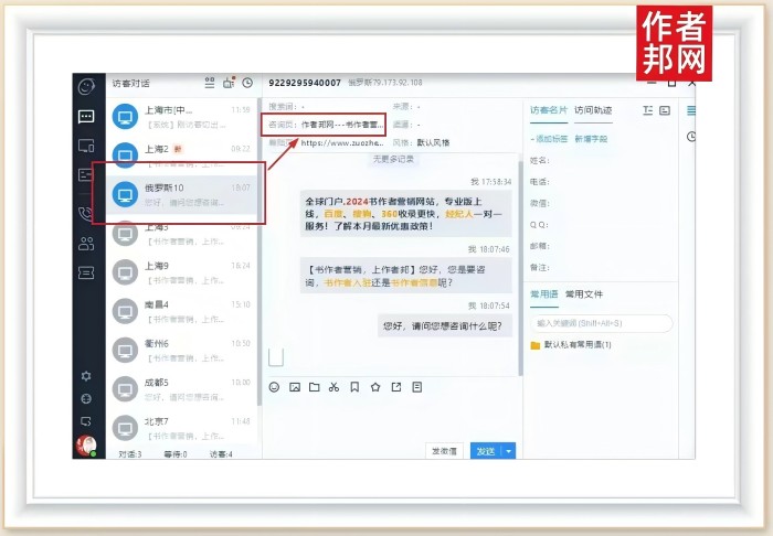俄罗斯访客的咨询交流,从地域上看,见证了作者邦网的影响力范围横跨海内外;从品牌的角度去看,作者邦网已经拥有了一定程度上的海外影响力和传播力;而从权威度上看,平台又已经具备了在访客的筛选对比中胜出的权威性。这些数据信息,都足够可以说明作者邦网的整体品牌实力和价值竞争力了!