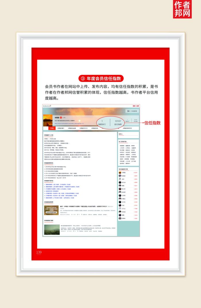 会员书作者在网站中上传、发布内容,均有信任指数的积累,是书作者在作者邦网信誉积累的体现,信任指数越高,书作者平台信用度越高。