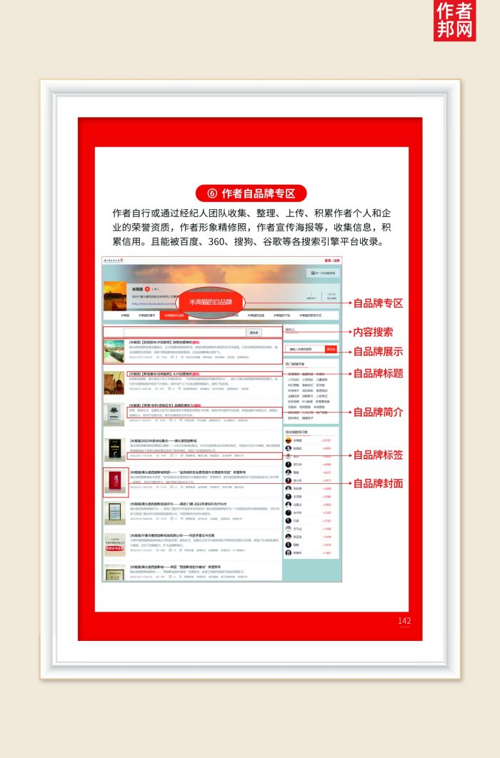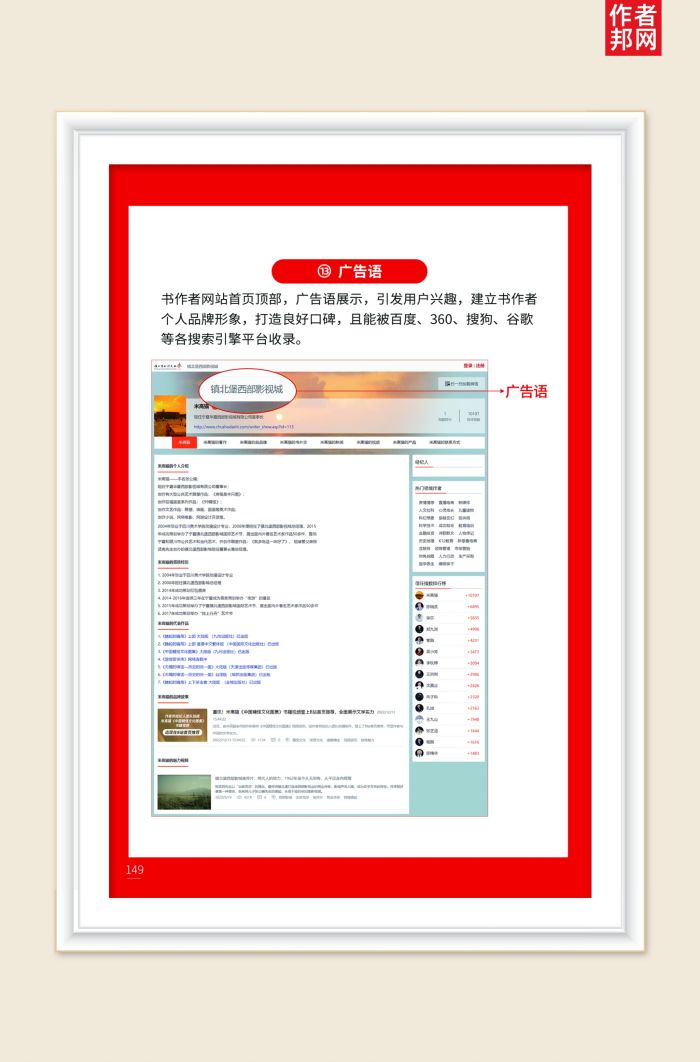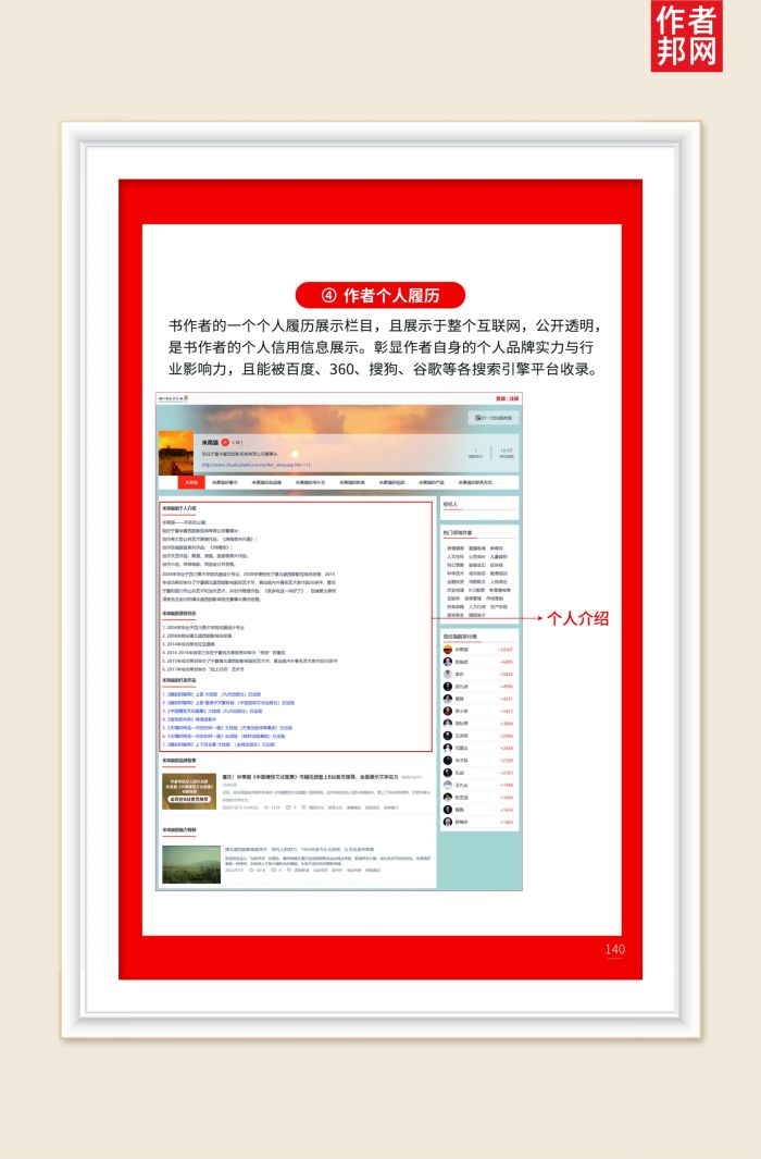 书作者的一个个人履历展示栏目,且展示于整个互联网,公开透明,是书作者个人信用信息展示。彰显作者自身的个人品牌实力与行业影响力,且能被百度、360、搜狗、谷歌等各搜索引擎平台收录。