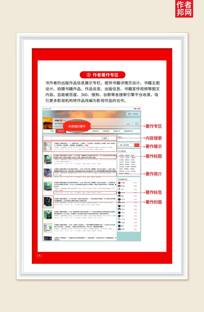 书作者的出版作品信息展示专栏,提供书籍详情页设计、书籍主图设计、拍摄书籍作品、作品信息、出版信息、书籍宣传视频等图文内容。且能被百度、360、搜狗、谷歌等各搜索引擎平台收录,吸引更多影视机构将作品改编为影视作品的合作。