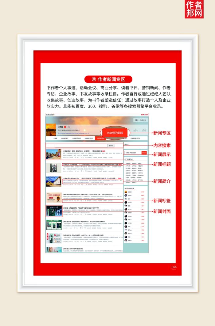 书作者个人事迹、活动会议、商业分享、读着书评、营销新闻、作者专访、企业故事、书友故事等收录栏目。作者自行或通过经纪人团队收集故事、创造故事,为书作者塑造信任!通过故事打造个人及企业软实力。且能被百度、360、搜狗、谷歌等各搜索引擎平台收录。