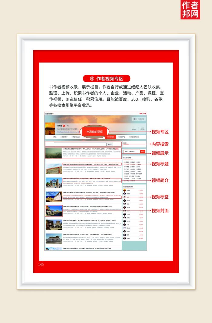 书作者视频收录、展示栏目,作者自行或通过经纪人团队收集、整理、上传、积累书作者的个人、企业、活动、产品、课程、宣传视频,创造信任,积累信用。且能被百度、360、搜狗、谷歌等各搜索引擎平台收录。