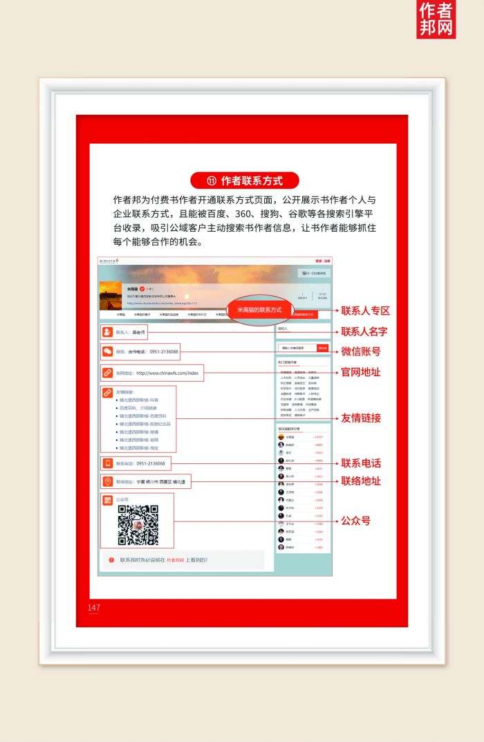 作者邦为付费书作者开通联系方式页面,公开展示书作者个人与企业联系方式,且能被百度、360、搜狗、谷歌等各搜索引擎平台收录,吸引公域客户主动搜索书作者信息,让书作者能够抓住每个能够合作的机会。
