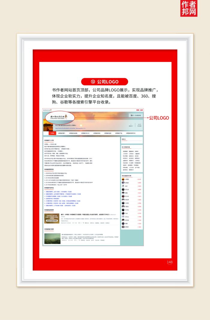 书作者网站首页顶部,公司品牌LOGO展示,实现品牌推广,体现企业软实力,提升企业知名度,且能被百度、360、搜狗、谷歌等各搜索引擎平台收录。