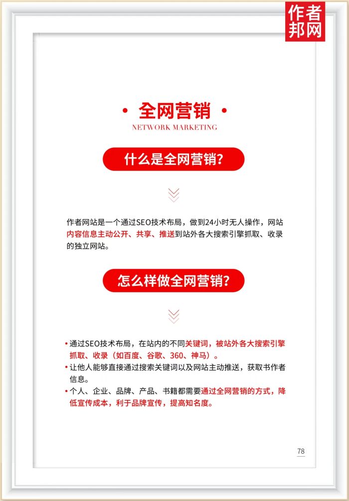 ·个人、企业、品牌、产品、书籍都需要通过全网营销的方式,降低宣传成本,利于品牌宣传,提高知名度。