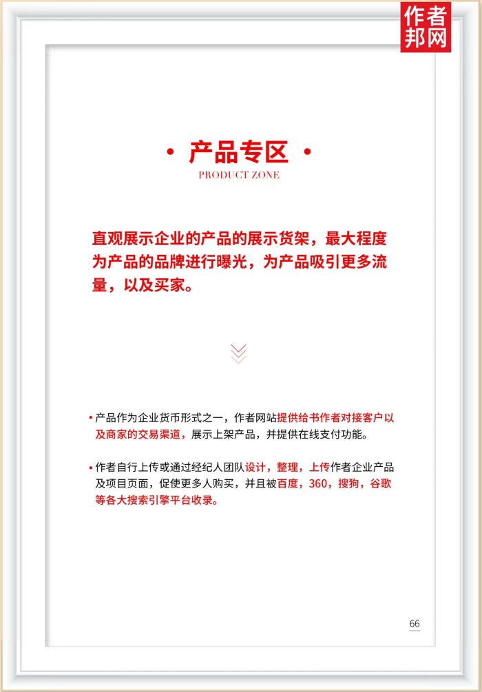 ·产品作为企业货币形式之一,作者网站提供给书作者对接客户以及商家的交易渠道,展示上架产品,并提供在线支付功能。