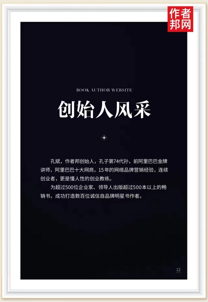 孔斌,作者邦创始人,孔子第74代孙,前阿里巴巴金牌讲师,阿里巴巴十大网商,15年的网络品牌营销经验,连续创业者,更是懂人性的创业教练。为超过500为企业家、领导人出版超过500本以上的畅销书,成功打造数百位诚信自品牌明星书作者。