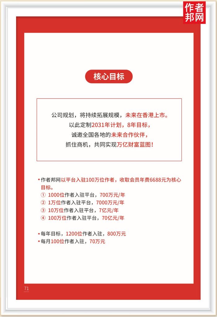 ·作者邦网以平台入驻100万位作者,收取会员年费6688元为核心目标。