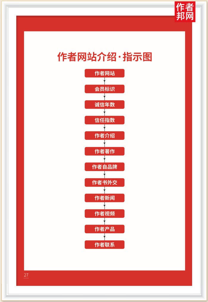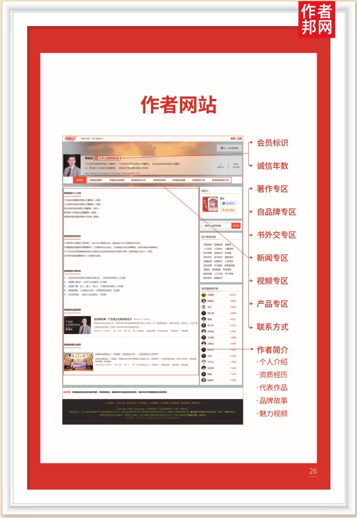 ·作者邦为书作者量身定制,书作者信用系统和书作者数据库。 ·包含会员标识、诚信年数、作者简介、著作专区、自品牌专区、书外交专区、新闻专区、视频专区、产品专区、联系方式。全方位展示书作者实力和存储书作者个人信用数据。