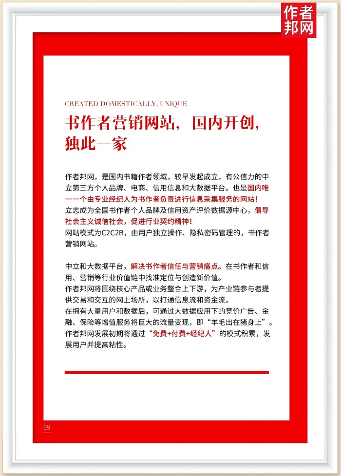 作者邦网,是国内书籍作者领域,较早发起成立,有公信力的中立第三方个人品牌、电商、信用信息和大数据平台。也是国内唯-一个由专业经纪人为书作者负责进行信息采集服务的网站!
