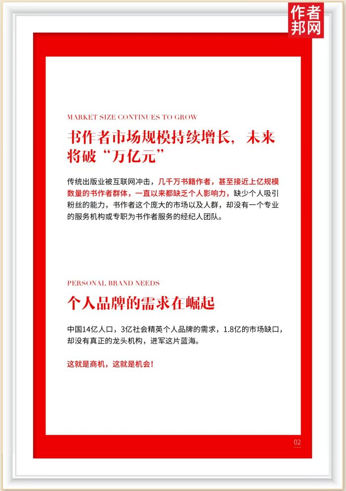 中国14亿人口,3亿社会精英个人品牌的需求,1.8亿的市场缺口,却没有真正的龙头机构,进军这片蓝海。 这就是商机,这就是机会!