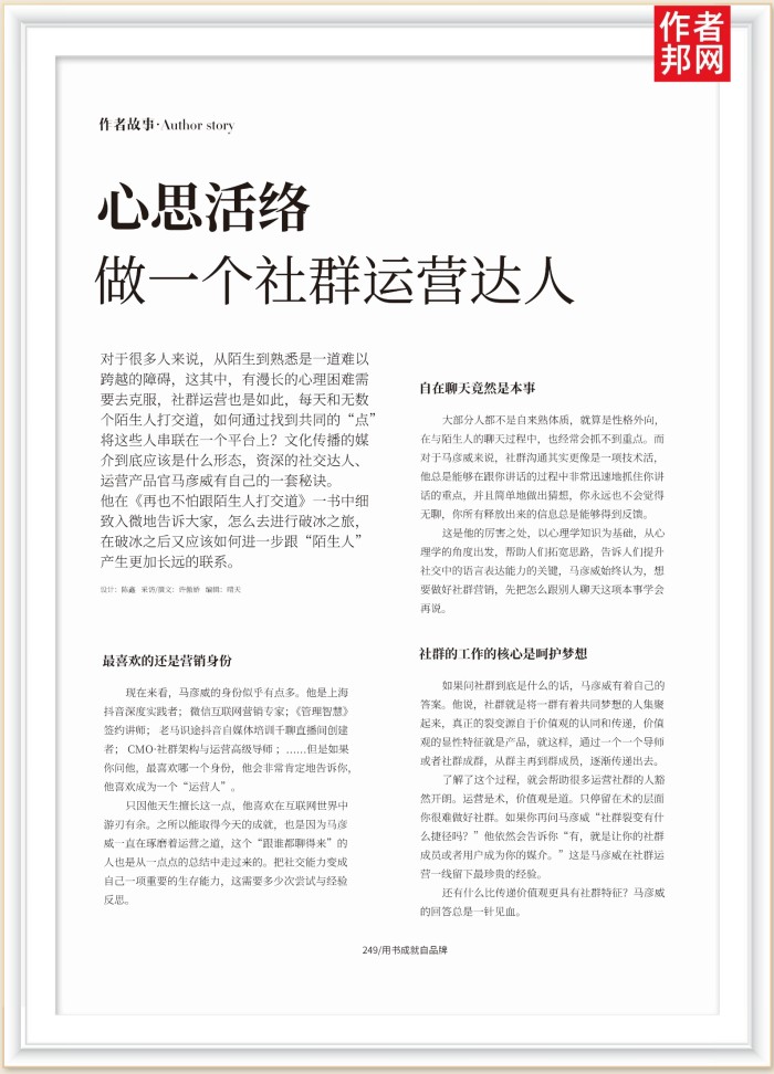 只因他天生擅长这一点,他喜欢在互联网世界中游刃有余。之所以能取得今天的成就,也是因为马彦威一直在琢磨着运营之道,这个“跟谁都聊得来”的人也是从一点点的总结中走过来的。把社交能力变成自己一项重要的生存能力,这需要多少次尝试与经验反思。