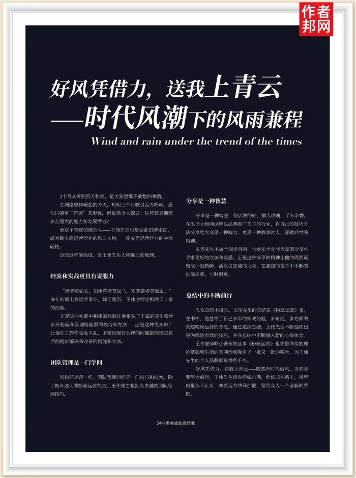 人在总结中进步。王伟先生的总结在《粉丝运营》里在书中,他总结了自己多年的实战经验,多角度、多方面的阐述粉丝运营的方法,通过这次总结,王伟先生不断提炼出更为练达有效的技巧,并在总结中不断融入新的心得体会。