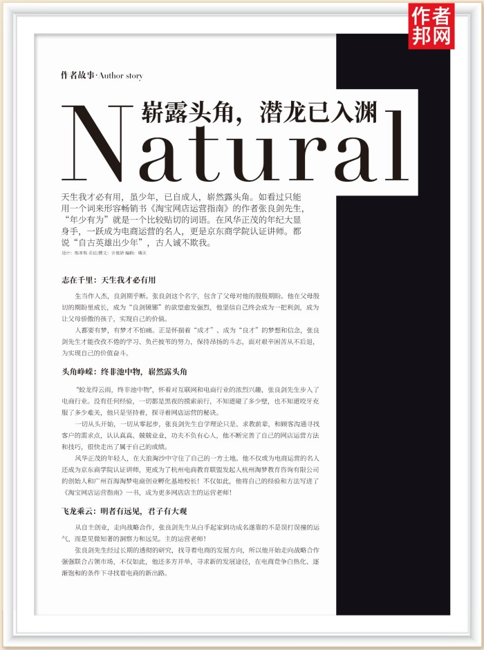 天生我才必有用,虽少年,已自成人,崭然露头角。如看过只能用一个词来形容畅销书《淘宝网店运营指南》的作者张良剑先生,“年少有为”就是一个比较贴切的词语。在风华正茂的年纪大显身手,一跃成为电商运营的名人,更是京东商学院认证讲师。都说“自古英雄出少年”,古人诚不欺我。