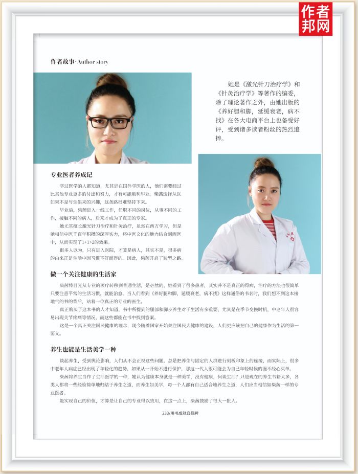 柴茜将目光从专业的医疗转移到普通生活,是必然的,她看到了很多患者,其实并不是真正的得病,治疗的方法也很简单只要注意平常的生活习惯,就能治愈。当人们看到《养好腿和脚,延衰老。病不找》这样通俗的书名时,我们想不到这本接地气的书的背后,站着一位真正的专业的医生。