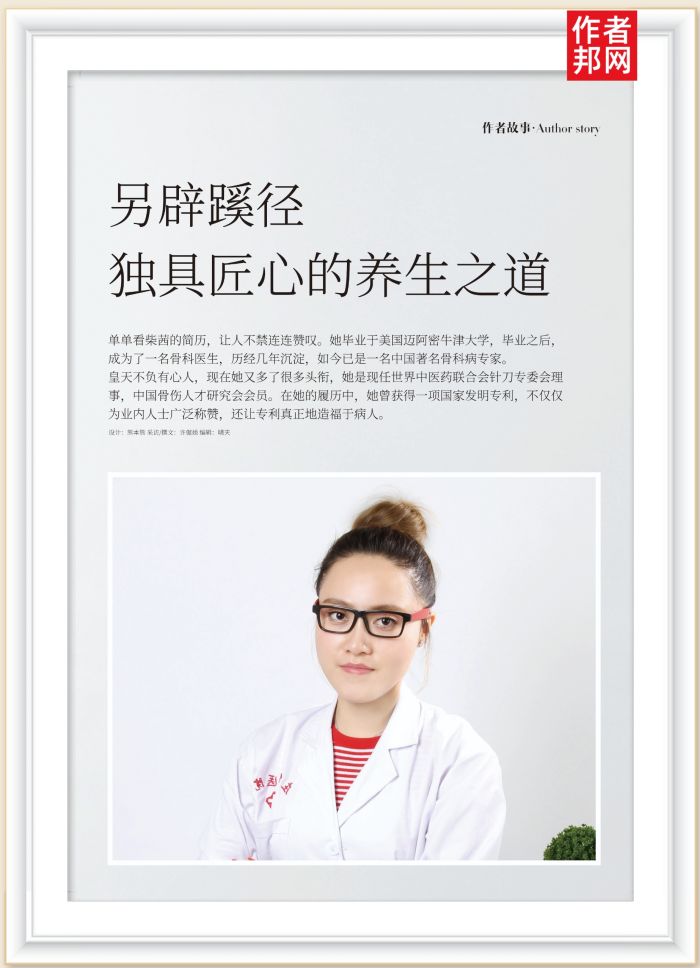 皇天不负有心人,现在她又多了很多头衔,她是现任世界中医药联合会针刀专委会理事,中国骨伤人才研究会会员。在她的履历中,她曾获得一项国家发明专利,不仅仅为业内人士广泛称赞,还让专利真正地造福于病人。