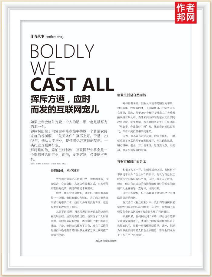 如果上帝会格外宠爱一个人的话,那一定是最努力的那一个谷树桐出生于内蒙古赤峰市翁牛特旗一个普通农民家庭的谷树桐,“先天条件”算不上好。于是,2008年,他从大学毕业,便怀着亿万富翁的梦想,头扎进互联网行业。
