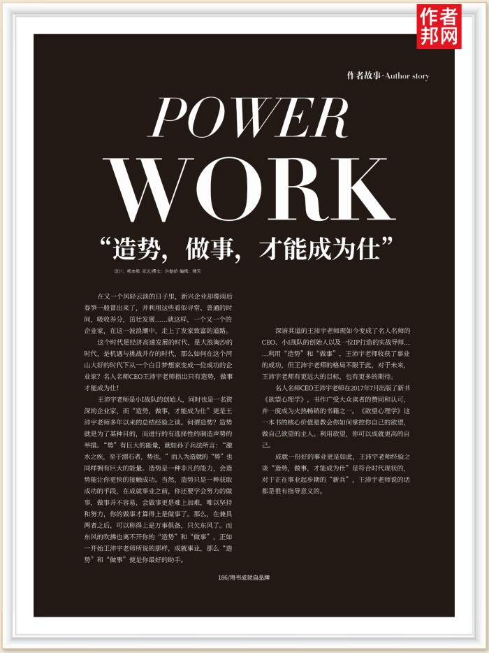 王沛宇老师是小I战队的创始人,同时也是一名资深的企业家,而“造势,做事,才能成为仕”更是王沛宇老师多年以来的总结经验之谈。何谓造势?造势就是为了某种目的,而进行的有选择性的制造声势的举措。“势”有巨大的能量,就如孙子兵法所言:“激水之疾,至于漂石者,势也。”而人为造就的“势”也同样拥有巨大的能量。造势是一种非凡的能力,会造势能让你更快的接触成功。当然,造势只是一种获取成功的手段,在成就事业之前,你还要学会努力的做事,做事并不容易,会做事更是难上加难,唯以坚持和努力,你的做事才算得上是做事了。那么,在兼具两者之后,可以称得上是万事俱备,只欠东风了。而东风的吹拂也离不开你的“造势”和“做事”,正如一开始王沛宇老师所说的那样,成就事业、那么“造势”和“做事”便是你最好的助手