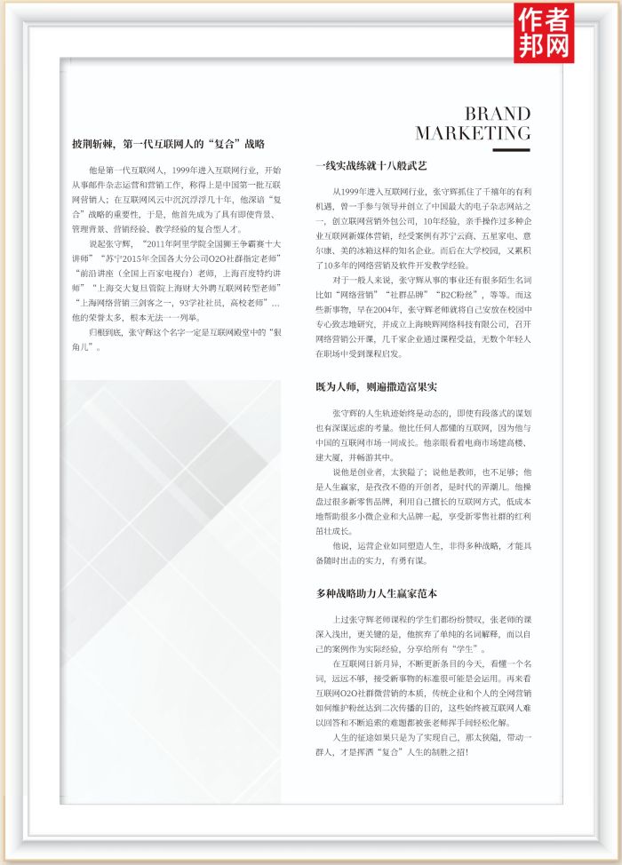 他是第一代互联网人,1999年进入互联网行业,开始从事邮件杂志运营和营销工作,称得上是中国第一批互联网营销人;在互联网风云中沉沉浮浮几十年,他深谙“复合”战略的重要性,于是,他首先成为了具有即使背景、管理背景、营销经验、教学经验的复合型人才。