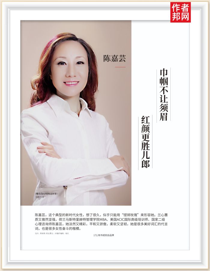 陈嘉芸,这个典型的新时代女性,想了很久,似乎只能用“铿锵玫瑰”来形容她。兰心蕙质又傲然坚强,荷兰马斯特里赫特管理学院MBA、美国ACIC国际高级培训师、国家二级心理咨询师陈嘉芸,她淡然又精彩,平和又骄傲,柔软又坚韧,她是很多美好词汇的代言词,也是很多女性奋斗的楷模。