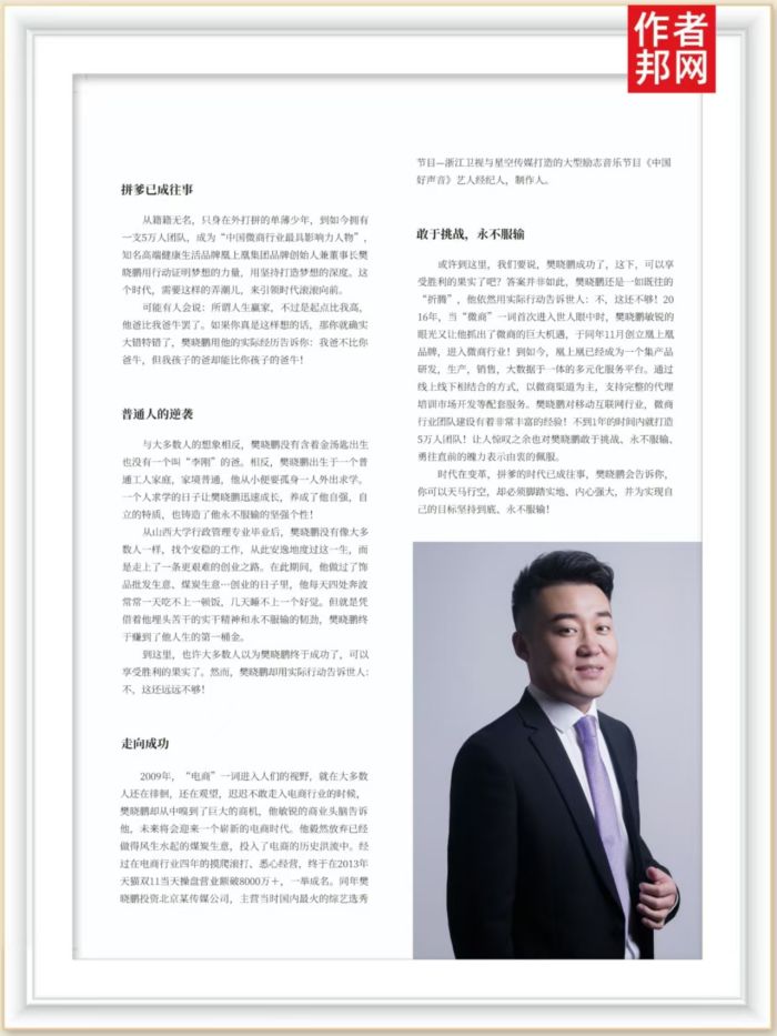 从籍籍无名,只身在外打拼的单薄少年,到如今拥有-支5万人团队,成为“中国微商行业最具影响力人物”,知名高端健康生活品牌凰上凰集团品牌创始人兼董事长樊晓鹏用行动证明梦想的力量,用坚持打造梦想的深度。这个时代,需要这样的弄潮儿,来引领时代滚滚向前。