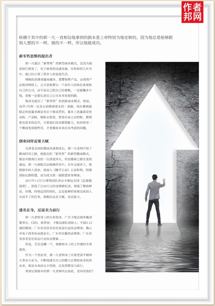 在席卷全国的微商风暴到来后,郭一凡老师开始了微商经营之路,他提出的“新零售”的新型微商模式,像是对微商行业的一次深度淬火,但是微商之路任重而道远。郭一凡却能自由地徜徉其中。在年会演讲上,他鼓励年轻人创业。他加入《随手公益》公益机构,组建国际社群联盟,成为成为第一届联盟常务理中。