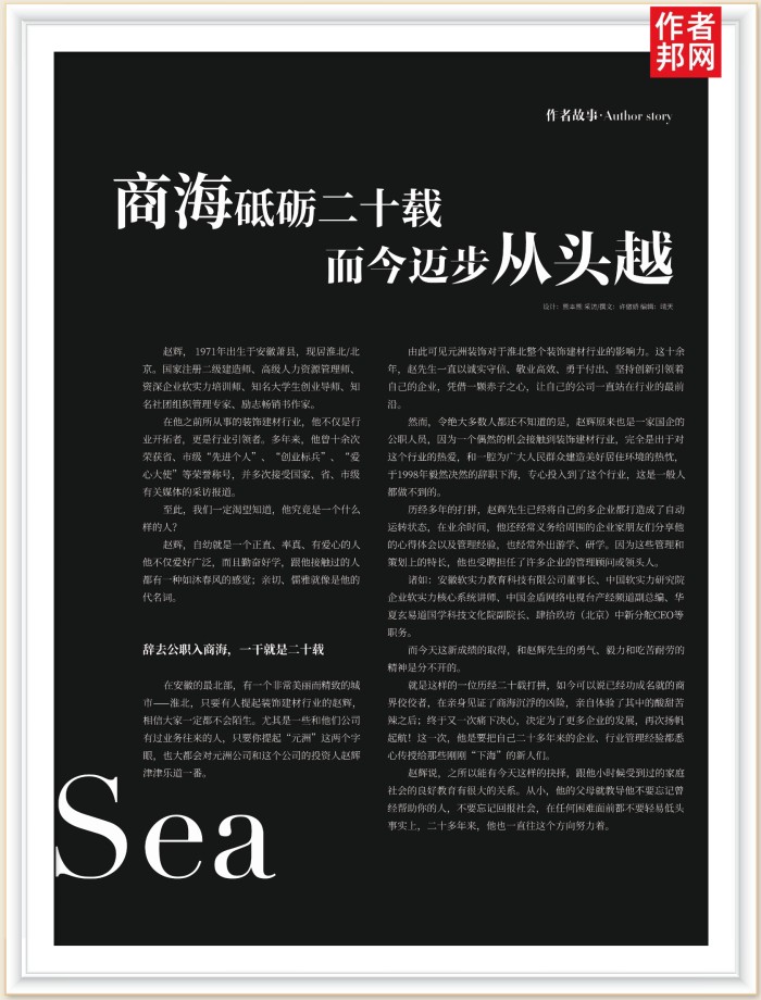 然而,令绝大多数人都还不知道的是,赵辉原来也是一家国企的公职人员,因为一个倒然的机会接触到装饰建材行业,完全是出于对这个行业的热爱,和一腔为广大人民非众建造美好居住环境的热忱,于1998年毅然决然的辞职下海,专心投入到了这个行业,这是一般人都做不到的。
