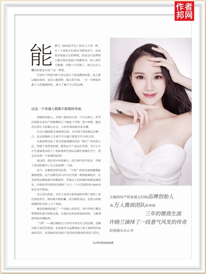 当身怀六甲的许晓兰决定创立兰研品牌的时候,没人想过她会成功,也没人能预料,她从零开始,一步一步缔造出愈万人的超级团队,成立了属于自己的品牌。