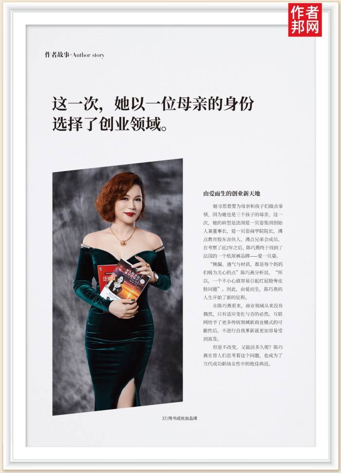 她寻思着要为母亲和孩子们做点事情,因为她也是三个孩子的母亲,这一次,她的转型是法国爱一贝姿集团创始人兼董事长,爱一贝姿商学院院长,沸点教育股东合伙人、沸点兄弟会成员。在考察了近2年之后,陈巧燕终于找到了法国的一个纸尿裤品牌——爱一贝姿。