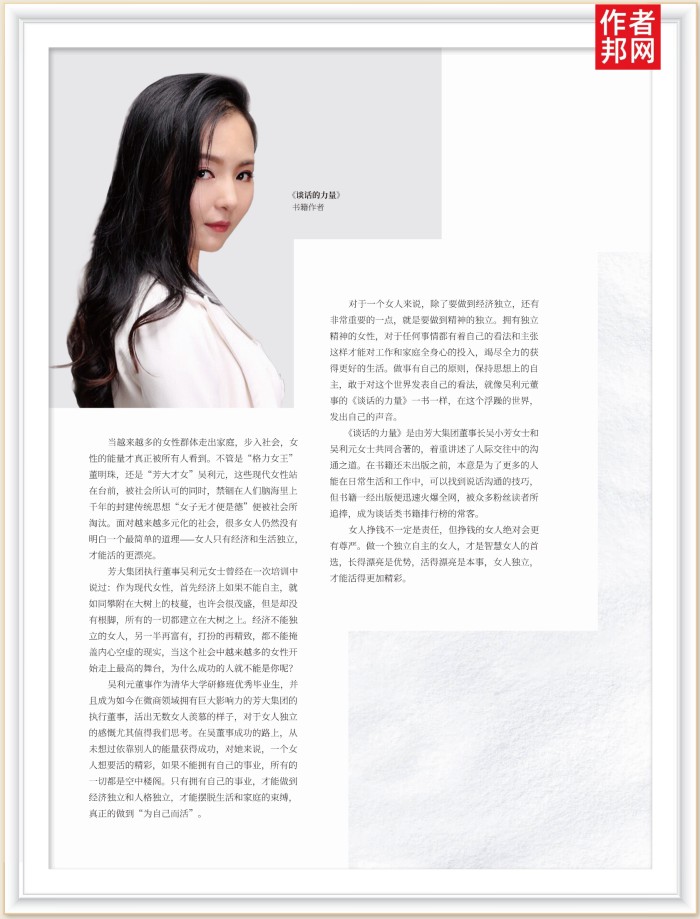 对于一个女人来说,除了要做到经济独立,还有非常重要的一点,就是要做到精神的独立。拥有独立精神的女性,对于任何事情都有着自己的看法和主张这样才能对工作和家庭全身心的投入,竭尽全力的获得更好的生活。做事有自己的原则,保持思想上的自主,敢于对这个世界发表自己的看法,就像吴利元董事的《谈话的力量》一书一样,在这个浮躁的世界,发出自己的声音。