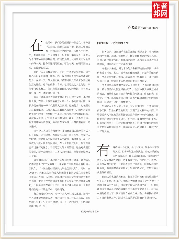 只有辉煌,还有寂寞。当你站在山巅,举目四望,空无一人的时候,如果能仍然保持对生活的激情,那将殊为不易,已经成为无数人偶像的吴利元,在人生获得成功后,从未对自己有过任何的懈怠。不管是芳大的日常管理、还是对代理们的培训、新产品的研发,太多太多的场合,都能看到她努力的身影。