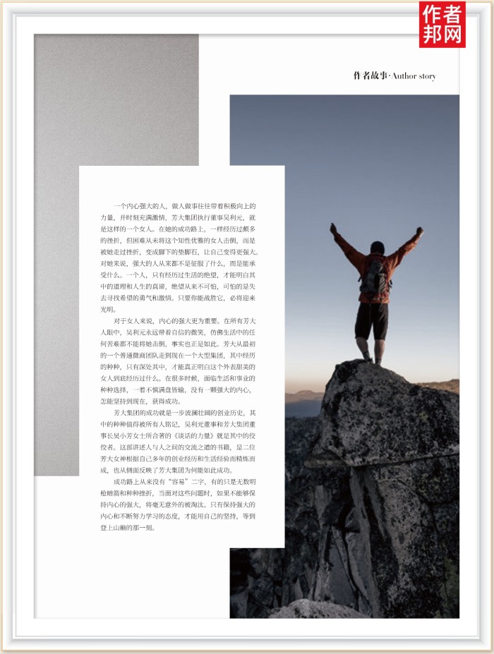 《谈话的力量》是由芳大集团董事长吴小芳女士和吴利元女士共同合著的,着重讲述了人际交往中的沟通之道。在书籍还未出版之前,本意是为了更多的人能在日常生活和工作中,可以找到说话沟通的技巧,但书籍一经出版便迅速火爆全网,被众多粉丝读者所追捧,成为谈话类书籍排行榜的常客。