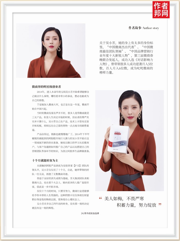 现如今的吴小芳已是山东芳大健康管理有限公司董事长皇胶世家、仁和闪亮、集草年华、健百滋等品牌联合创始人新生代微商界传奇代表人物,CCTV证券资讯专访嘉宾,青少年公众演说实战导师,微营销行业著名沟通成交专家,40万FD团队创业导师。
