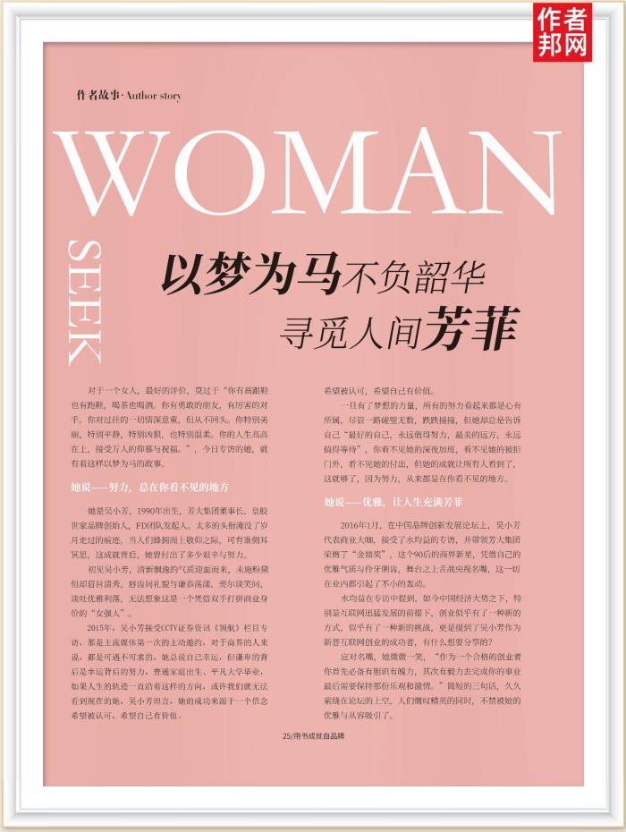 2015年,吴小芳接受CCTV证券资讯《领航》栏目专访,那是主流媒体第一次的主动邀约,对于商界的人来说,都是可遇不可求的,她总说自己幸运,但谦卑的背后是幸运背后的努力,普通家庭出生、平凡大学毕业,如果人生的轨迹一直沿着这样的方向,或许我们就无法看到现在的她,吴小芳坦言,她的成功来源于一个信念希望被认可,希望自己有价值。希望被认可,希望自己有价值。